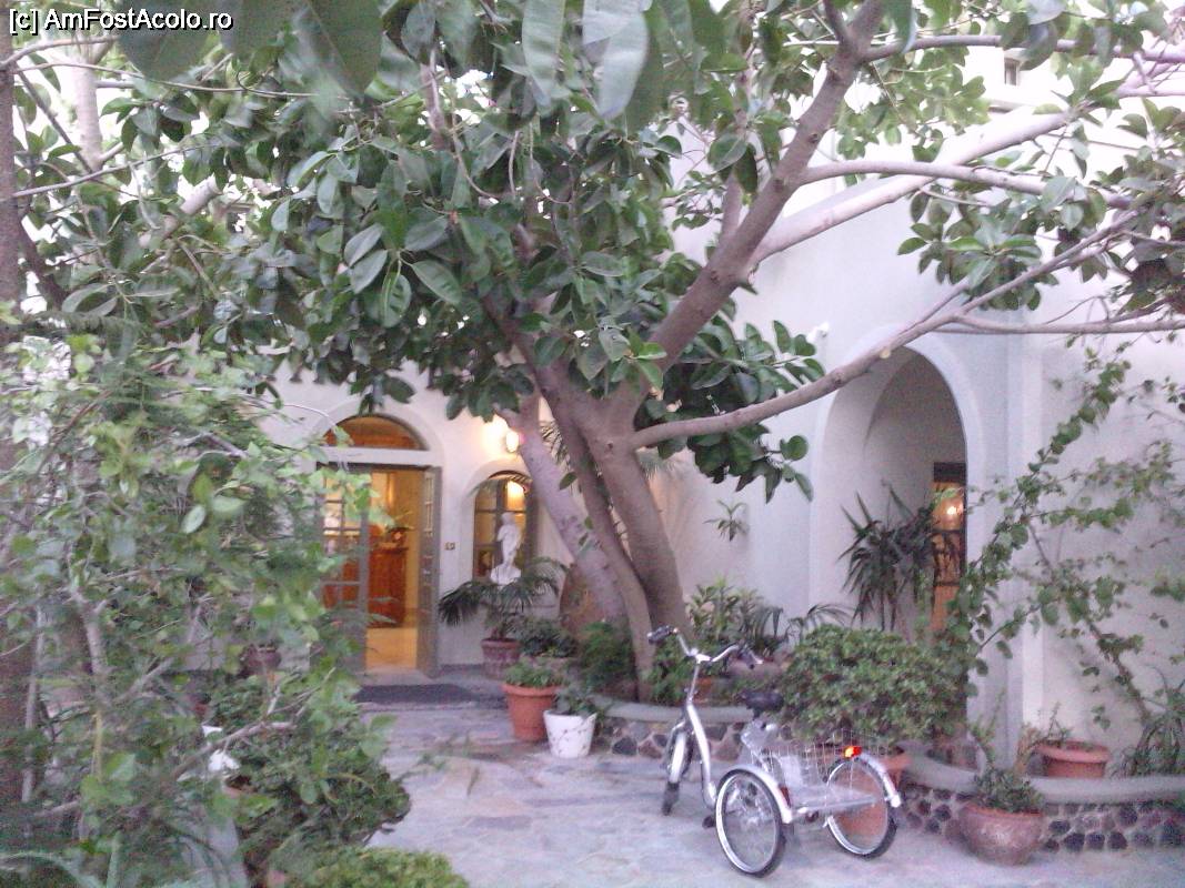 [P08] Curtea hotelului Zephyros, din Kamari (f frumoasa) - umbrita, dimineata mancam afara, la umbra copacilor