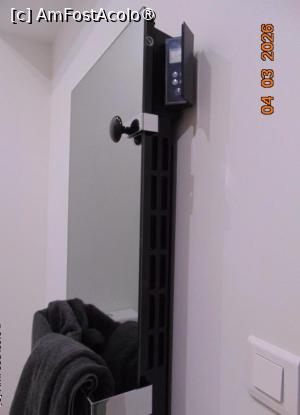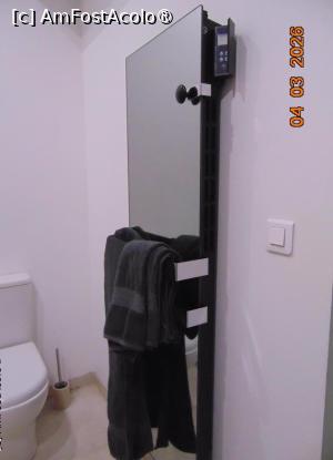 Baia este la etaj, din camera intri direct în baia spatioasa dotata cu dus cu para fixa si unul mobil, chiuveta cu dulapior cu doua sertare, un foen, oglinda deasupra chiuvetei, vasul de toaleta cu suportul pentru hârtia igienica (doua role), si alaturi o oglinda mare pe verticala cu suport de prosoape în fata si în spatele oglinzii prins de ea este dispozitivul electric de încalzire a încaperii. Pe rama laterala este un panou mic ca o telecomanda pentru pornire/oprire/reglare caldura. Foarte interesant!