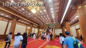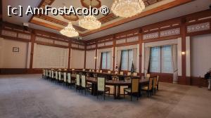 Dupa scanarea codului de bare primit la rezervare, am intrat in curte si am vizitat cladirea numita Yeongbingwan, care gazduia evenimente oficiale si banchete, intalniri de stat si receptii, construita in 1978. Aici aveau loc spectacole de dans traditional si banchete pentru a intampina alti sefi de stat. Cladirea este construita in stil coreean combinat cu cel occidental, cu un tavan foarte inalt, creand o atmosfera grandioasa si opulenta.