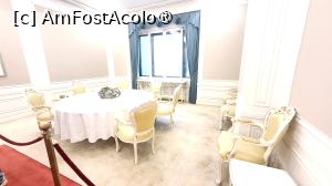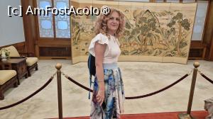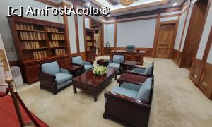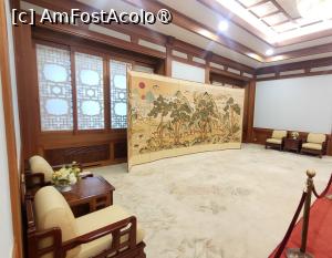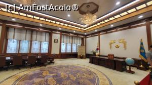 Am urcat scarile din lemn pentru a vizita incaperile de la primul etaj si am ajuns la biroul Primei Doamne, Camera Mugunghwa, folosita de sotiile presedintilor ca sala de receptie pentru oaspetii straini. Sala este decorate in stil occidental, pe un perete fiind expuse portrete ale fostelor doamne, insa exista si un birou decorat in stil coreean.