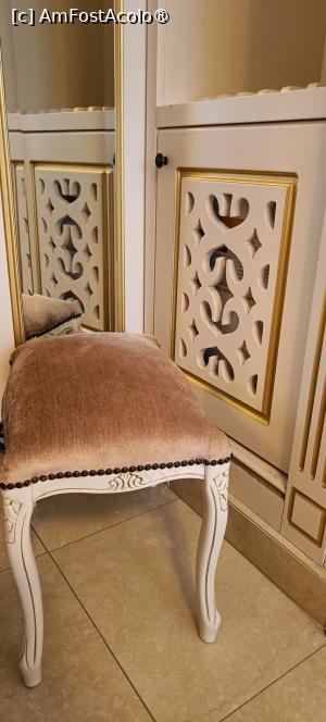 În cameră ai doar loc de trecere în jurul patului, iar unul din scaune l-am scos pe balcon pentru a avea loc mai mult. S-a încercat eficientizarea spațiului redus avut la dispoziție, aceasta fiind structura clădirii ridicate probabil în perioada comunistă. Salteaua a fost comodă pentru noi, lenjerie albă, perne potrivite (plus două pernuțe mici decorative). Apreciez ca un plus faptul că noptierele și măsuța de toaletă erau acoperite cu sticlă. Există perdea și draperii; era curățenie în camera primită.