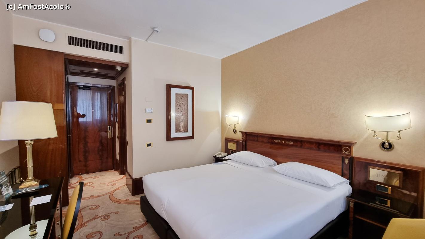 Mi-au plăcut detaliile, veiozele cu accente clasice, biroul din lemn masiv, fotoliul așezat lângă măsuță, televizorul smart imens (pe care, recunosc, l-am folosit doar pentru muzică italiană, seara). Minibarul era bine aprovizionat, iar hotelul ne lăsa zilnic o sticlă de apă plată gratuită, un gest mic, dar care contează.