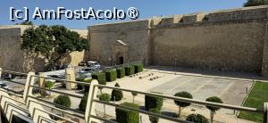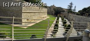 Ajunși la destinație, este suficient să traversăm un mic spațiu verde (un panou ceva mai încolo ne spune că sunt Grădinile Howard), pentru a ajunge în dreptul unui zid de apărare impunător, ce seamănă perfect cu cel al Fortului St. Elmo din Valletta. Prima imagine este promițătoare. Zidul este dublat de un șanț extrem de lat, care îmi aduce aminte de Cetatea Cavalerilor Ioaniți din Rodos.