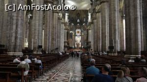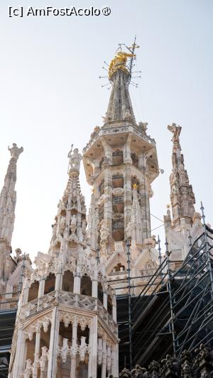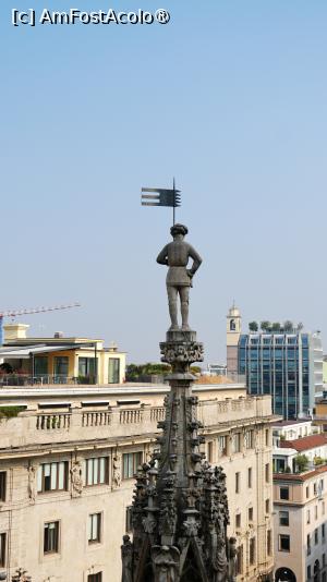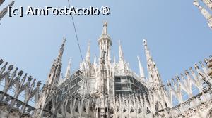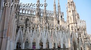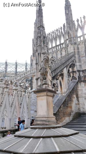 La ora 12:00, am avut rezervarea pentru Duomo. Am ajuns cu 30 de minute înăinte tocmai pentru că știam că se formează cozi imense și n-aș fi vrut să ratez ora, deși nu era un capăt de țară dacă aș fi întârziat sau aș fi venit mai devreme. Ora este orientativă, pentru a fluidiza turiștii și a nu permite aglomerația la anumite ore de trafic maxim. Am găsit intrarea "Gate 2 Azzurro", care asigura accesul către acoperiș cu liftul, undeva în partea din spate stânga a edificiului și odată cu ea am descoperit o minunată coadă care șerpuia prin culoarul creat de gardurile de protecție. Cam 45 de minute am stat la acea coadă admirând cum cei cu bilete care asigură accesul rapid la lift trec înăintea noastră, a celor care așteptam cuminți rândul. Mi-a părut rău că n-am optat pentru sportul pe scări, cu siguranță aș fi ajuns pe acoperiș mult mai repede decât cu liftul. Lift în care încăpeau 6 persoane. Achiziționarea biletelor online, în avans, de pe site-ul oficial Duomo Milano, este obligatorie. Cozile sunt imense. Am ales tariful de 26€ cu liftul pe terasă, acces în catedrală, muzeu și zona arheologică (ticket.duomomilano.it/cat ... goria/biglietti). Sunt 2 zone arheologice. Una în partea din față a catedralei, una în spate. Biletul nostru asigura intrarea pentru partea din spate. Terasa este punctul culminant al vizitei. Să te plimbi printre statui și arcade, cu orașul la picioare, este o experiență inedită.