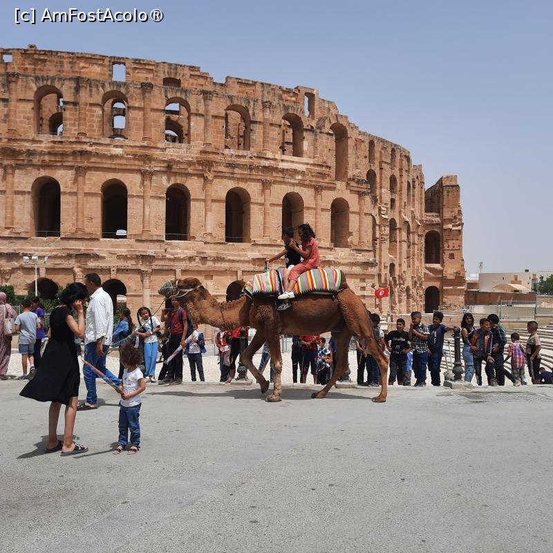 [P04] El Jem, Amfiteatrul, Piața cu destui turiști, mulți copii și câteva cămile, poză normală