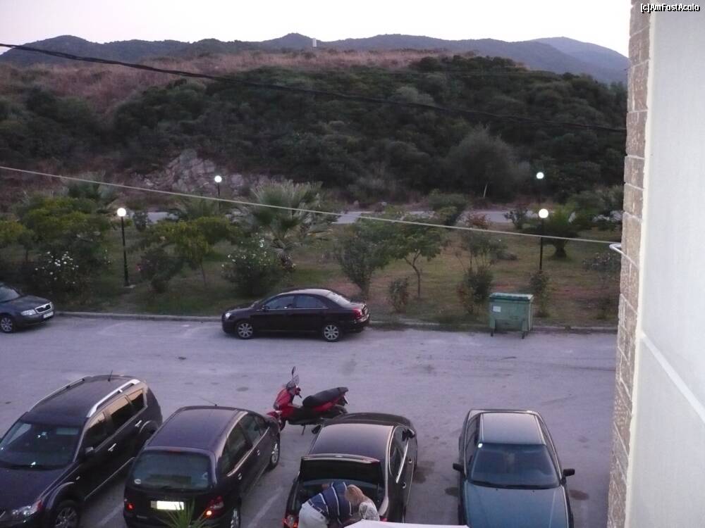 [P07] Parcarea plina de masini de Ro si gradina din fata hotelului.
