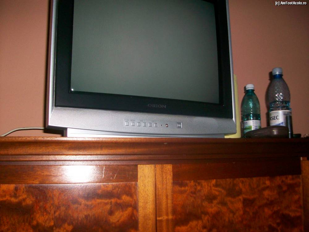 [P08] Televizorul aflat pe un dulapior in interiorul caruia se afla frigiderul, iar sub el un alt dulapior cu doua usi.