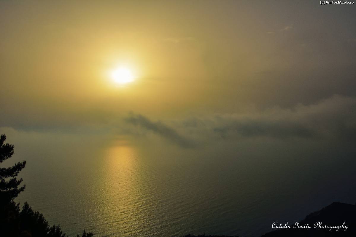 [P09] Apus de soare prin ceata vazut de pe acoperisul Lefkadei.