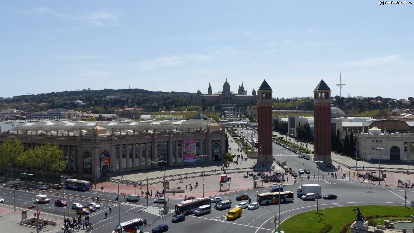 [P02] Placa d'Espanya văzută de pe terasa mall-ului Las Arenas, cu Turnurile Veneţiene şi MNAC în plan îndepărtat.