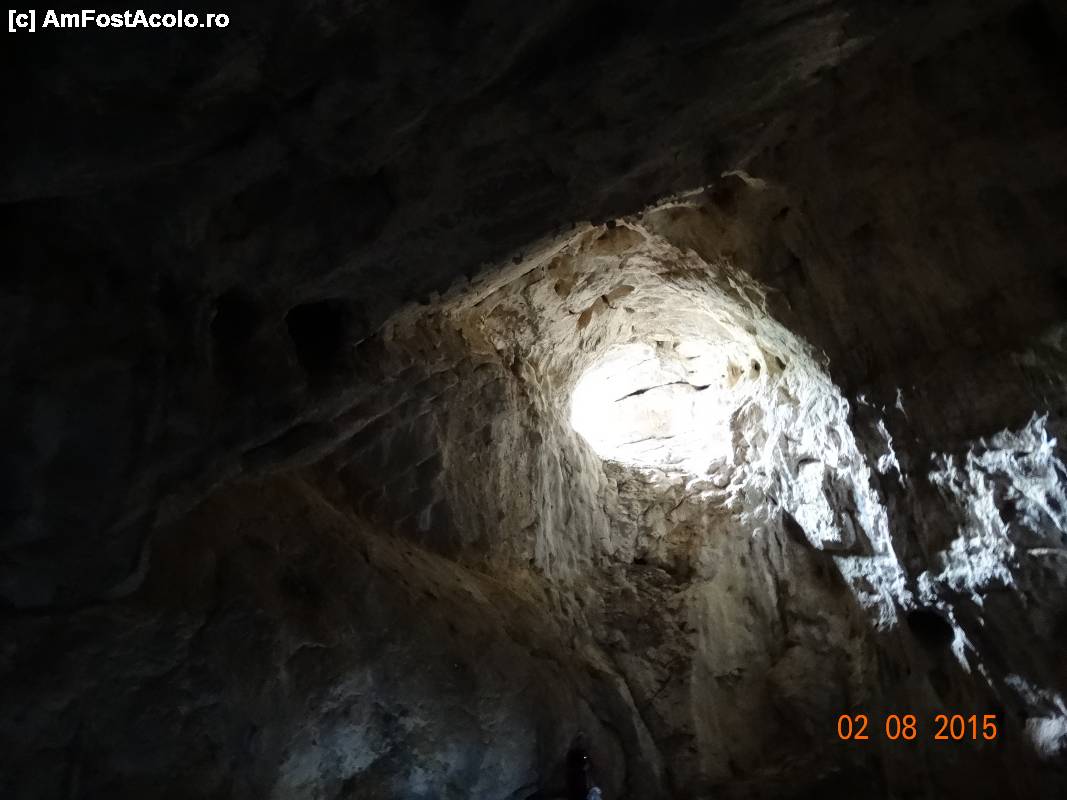 [P40] Clisura Dunãrii. Deschizatura (luminatorul) sapata in stanca de catre daci la ~ 15 m inaltime prin care lumina zilei cade perpendicular pe altarul din interior.