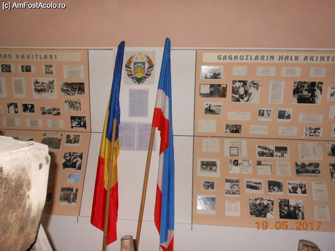 [P39] Beșalma - Muzeul Național Găgăuz de Istorie și Etnografie. Stema găgăuză flancată de steagul Republicii Moldova și cel al Uniunii Teritoriale Autonome Găgăuzia...