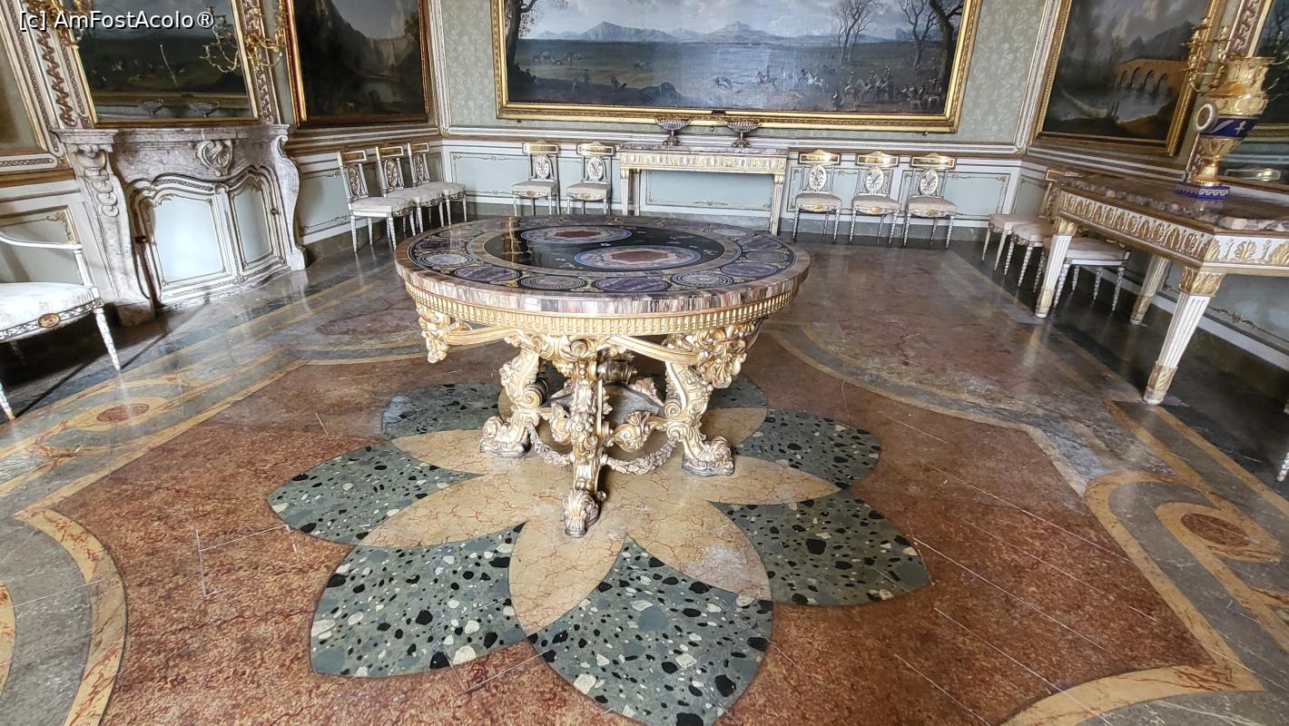 [P11] In centrul camerei este o masa decorata cu pietre semipretioase, in centru avand doua agate mari ovale inconjurate de insertii de mozaic reprezentand flori, fluturi si alte insecte, pe un suport de piatra, opera directorului Laboratorului regal de pietre semipretioase din Napoli.
