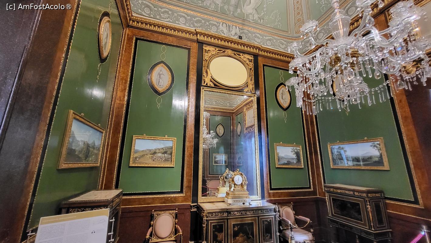 [P14] Dressingul regelui- decoratiunile tavanului amintesc de stilul pompeian, referire la campaniile de excavare de la Pompei si Herculaneum incepute de Carol de Bourbon. Camera este mobilata in stil Ludovic al XVI-lea, iar peretii sunt acoperiti cu hartie de damasc de orgine franceza. Pe comoda este un