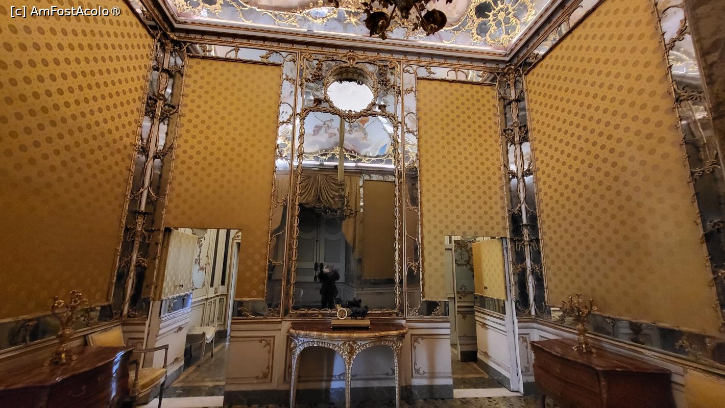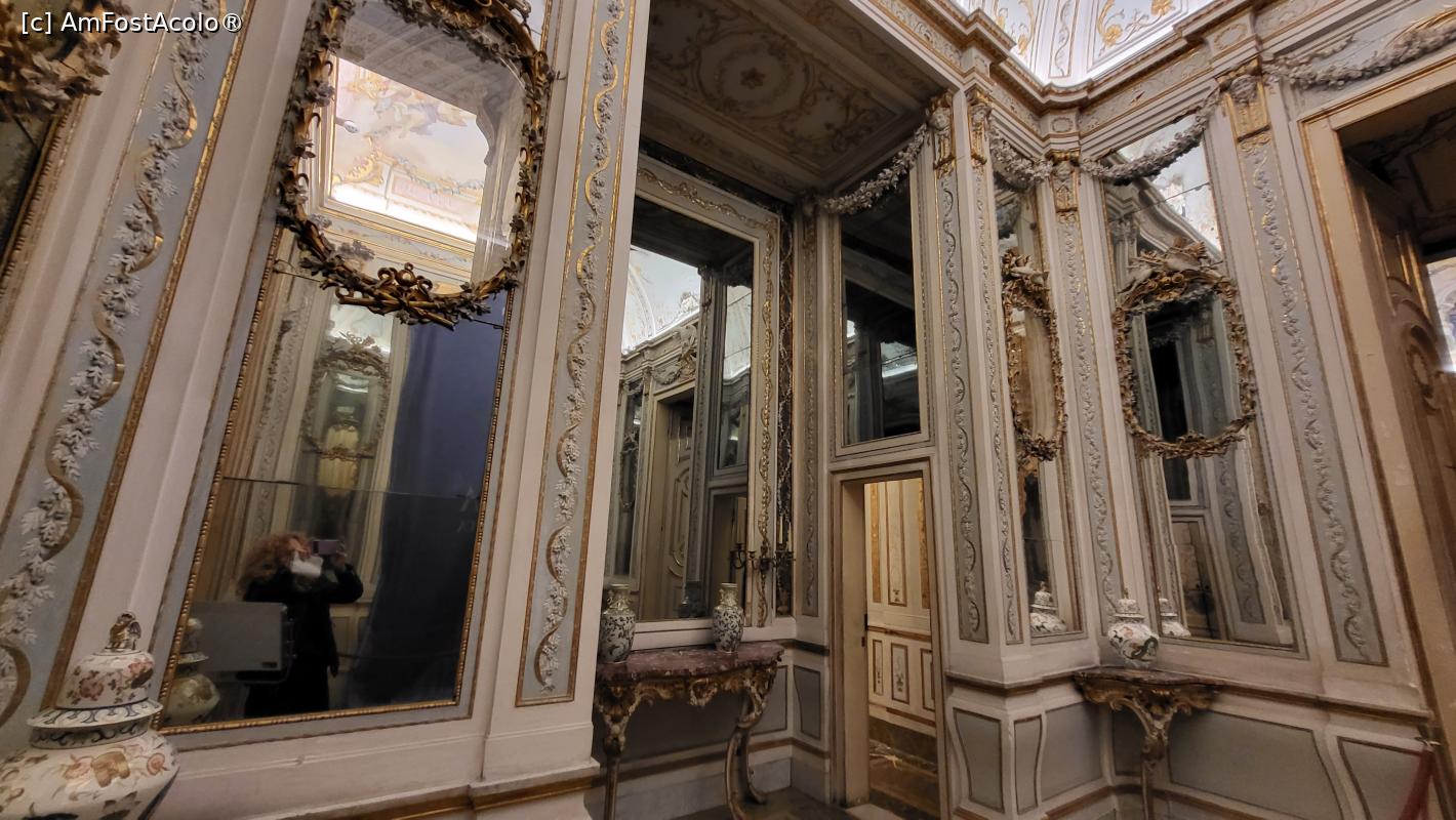 [P16] Budoirul Mariei Carolina este decorat exuberant in stil rocaille, cu oglinzi si stucaturi din abundenta, care contrasteaza cu stilul neoclasic sever al camerelor regelui Ferdinand.