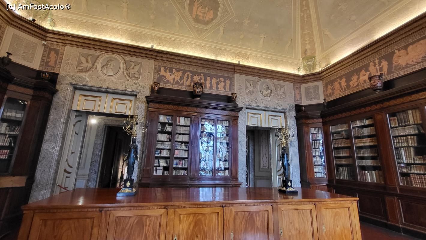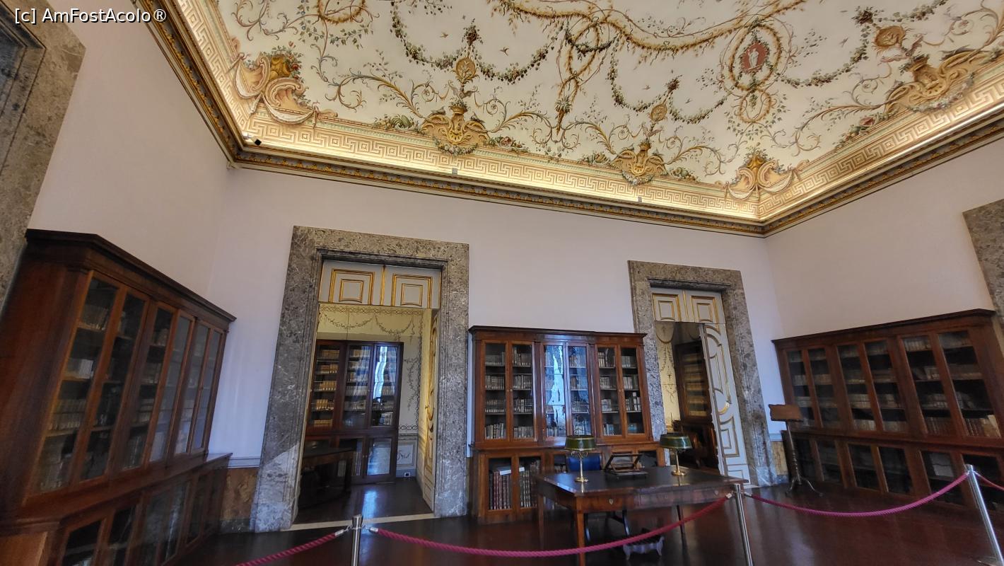 [P29] In Prima incapere a Bibliotecii Palatine, fresca de pe tavan infatiseaza planisfera inconjurata de semnele zodiacului si constelatii. Vasele din teracota aranjate pe rafturi originale de mahon contribuie la stilul neoclasic.
