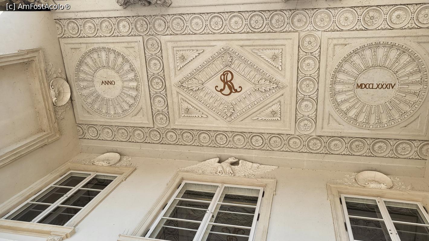 [P03] Porticul palatului de pe insula a fost construit in 1784, prin adaugarea la fatada baroc originala, a doua constructii, spatiul fiind umplut cu patru coloane corintiene. Deasupra usii de intrare sunt stucaturi cu tematica marina, dar si un mesaj in limba latina, care in traducere inseamna: ,,Acest om uraste, iubeste, lauda si doreste melancolie, pace, o baie si fapte bune.”