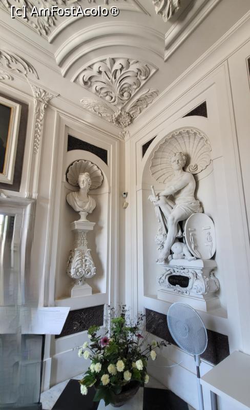 [P19] Antecamera este un hol spatios, dreptunghiular, simplist decorat cu statui reprezentand-o pe Afrodita iesind din apa, pe Venus, dar si figuri din bronz ale lui Voltaire și Rousseau.