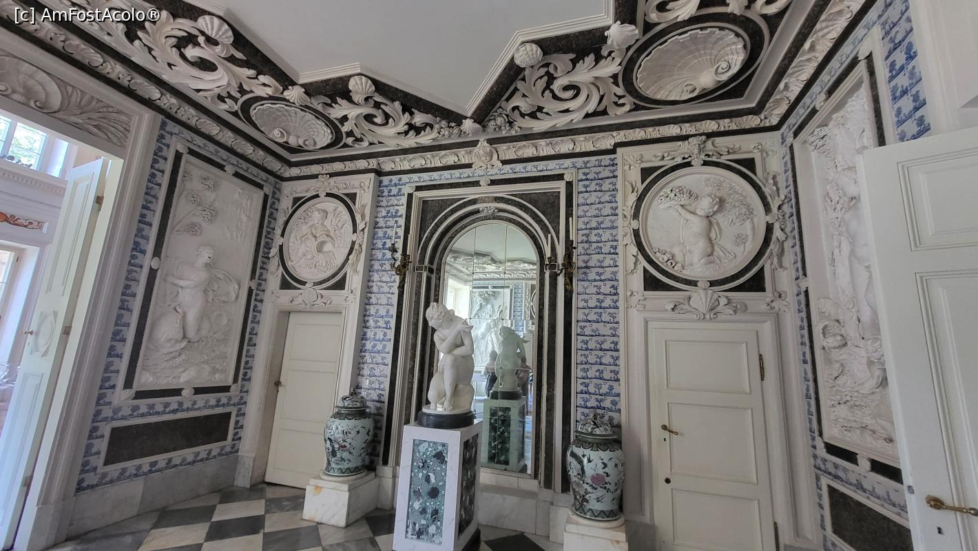 [P07] Baia avea doua cazi de marmura incastrate in podea, iar peretii salii, la fel ca si ai camerei lui Bacchus, sunt captusiti cu plăci ceramice. Decorul din stuc este foarte bogat, in stil baroc, cu motive ale dragostei, apei, basoreliefuri care infatiseaza figuri din Metamorfozele lui Ovidiu, dar si trei medalioane rotunde infatisandu-l pe Cupidon.