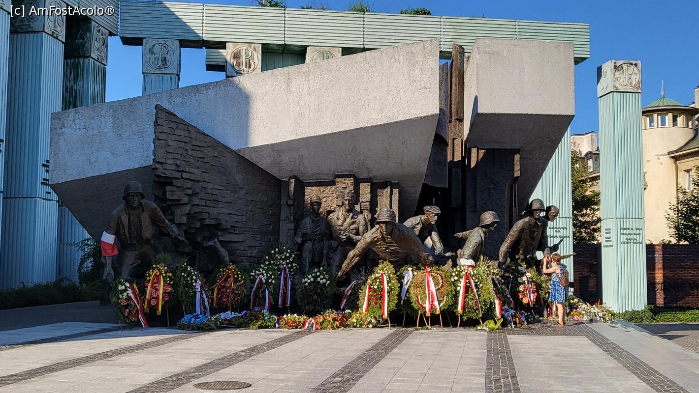 [P15] Monumentul Revoltei din Varsovia a fost dezvelit in 1989, dedicat revoltei care a avut loc acolo in 1944, revolta despre care am tot pomenit. Aceasta a izbucnit ca si consecinta a celor cinci ani de ocupatie nazista a orasului. Monumentul infatiseaza un grup de partizani polonezi in timp ce alergau sub ruinele unei cladiri in cadere.