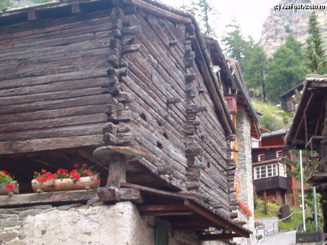 [P02] Case pe piloni , izolate cu placi rotunde de ardezie , butuci scobiti plini cu flori = Zermatt