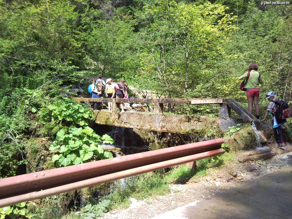 [P05] podul ce trece peste piriul destul de involburat. Se vede canalizarea ce aduce apa rece a izvorului ce iese de la poarta pesteii.