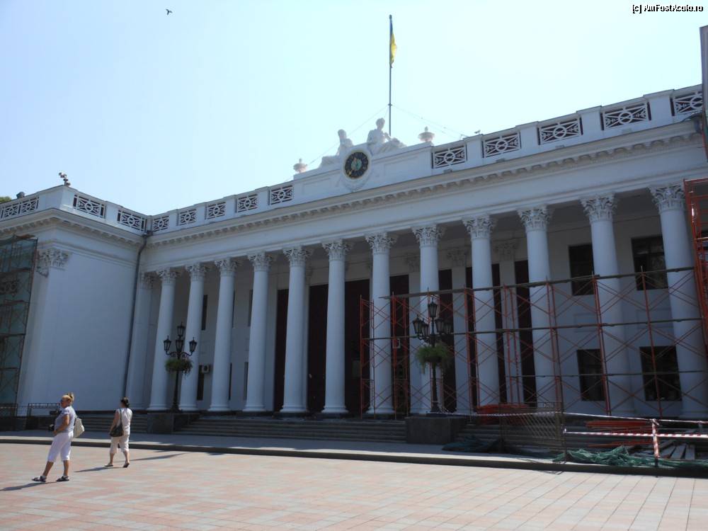[P05] Odesa - Cladirea Primariei decorata cu coloane si statui, se afla langa faleza.