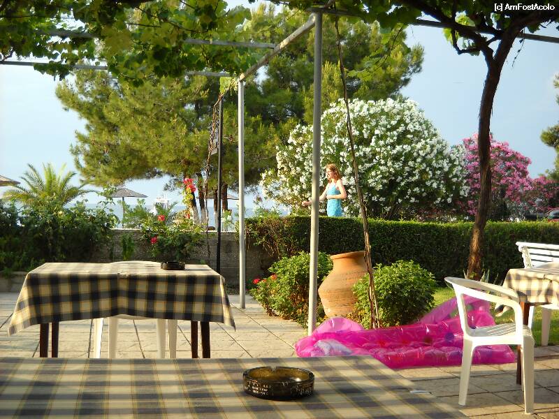 [P09] Terasa hotelului Elektra Beach Skala Prinos era atat de comuh romanilor bolta de vita sus si scaune de plastic proprietarul mai avea si pretentia sa ne adunam singuri scrumierele si daca nu o faceam ne zicea "tigani" cata lipsa de diplomatie 15 camere erau pentru romani jumate din hotel avea contract de inchieriere cu christian Tour dar nu stia sa se poarte cu cei de pe urma carora manca....fara cuvinte am ramas