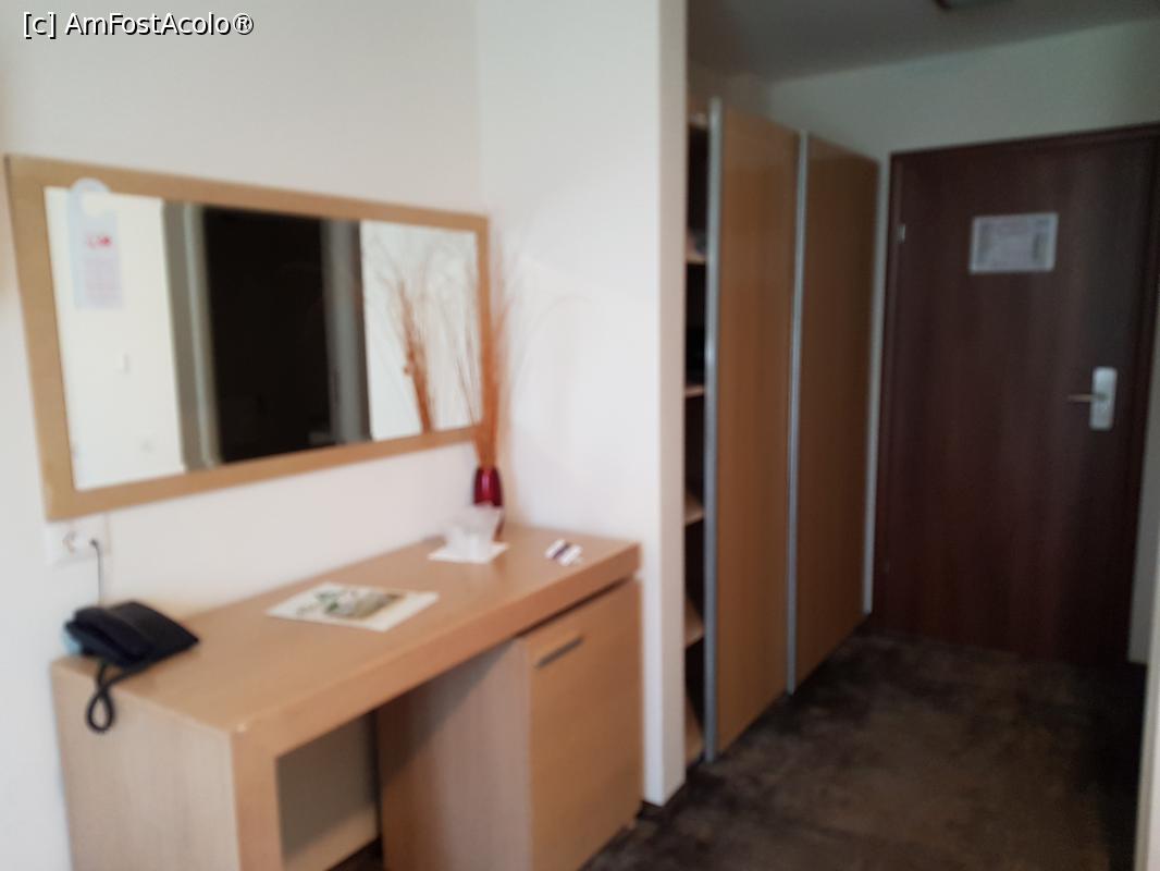 [P10] Camera văzută din alt unghi. Se observă biroul cu minibarul, televizorul și dulapul din holul încăperii.