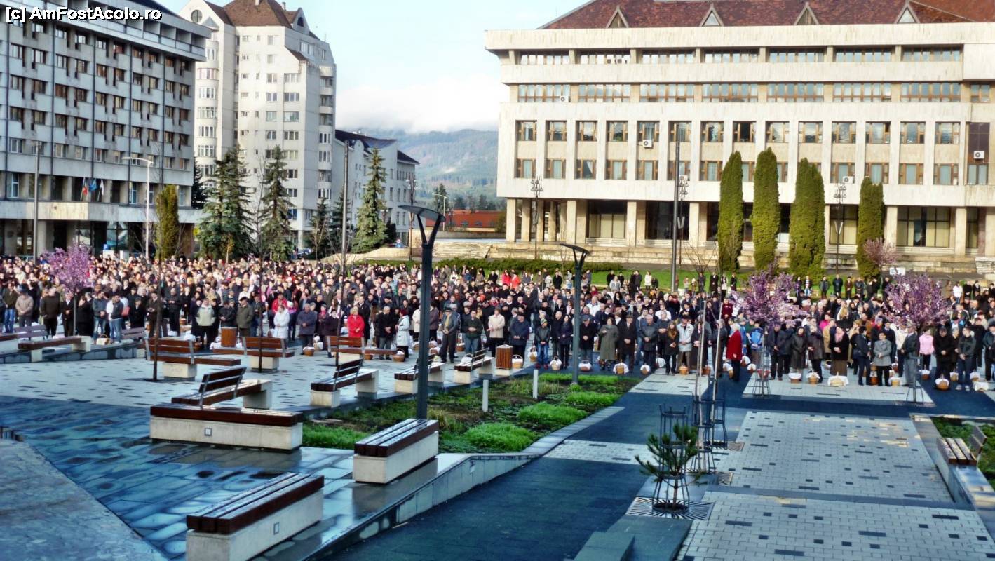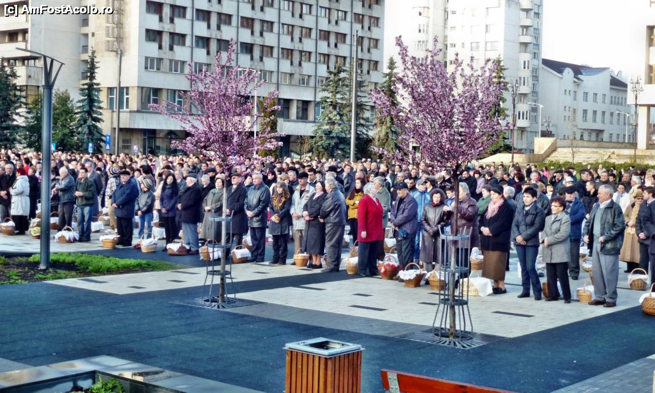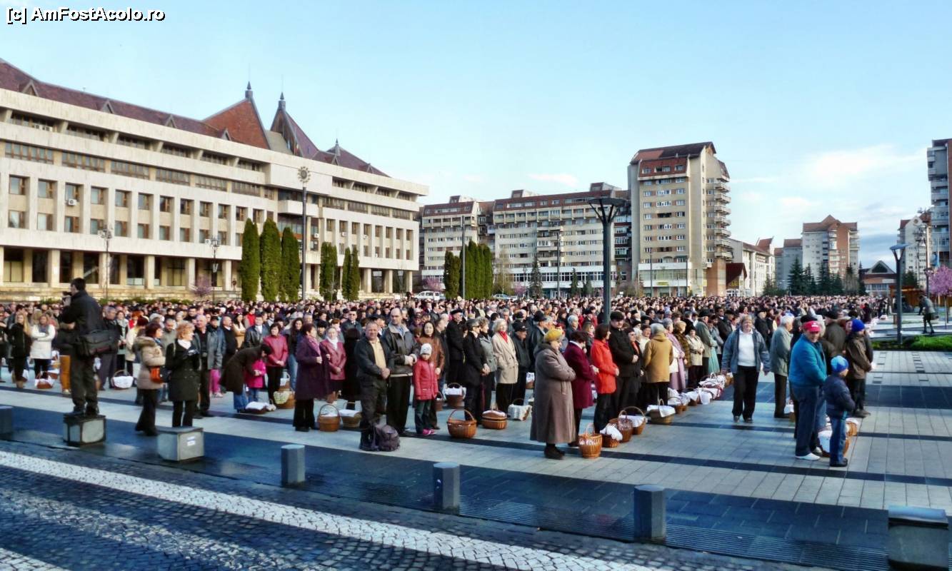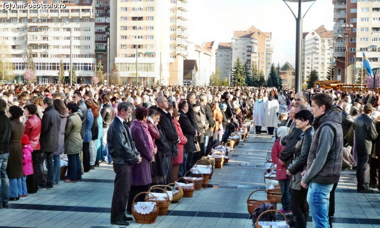 [P14] Imagine de ansamblu cu miile de credincioşi catolici adunaţi la slujba de sfinţire a bucatelor de Paşte pe platoul din centrul oraşului Miercurea Ciuc