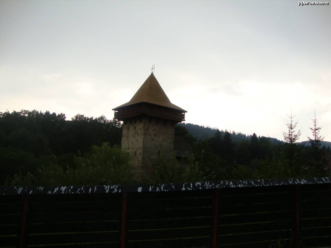 [P02] Am ajuns pe seară în apropierea Mănăstirii Humor. Peste gard se vede turnul de apărare a mănăstirii, construit de domnitorul moldovean Vasile Lupu în anul 1641.