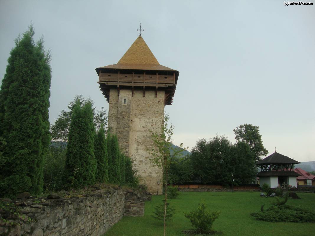 [P20] Turnul de apărare de la Mănăstirea Humor văzut din alt unghi. Se observă și câteva ruine ale fostului zid de apărare care a împrejmuit odinioară biserica.