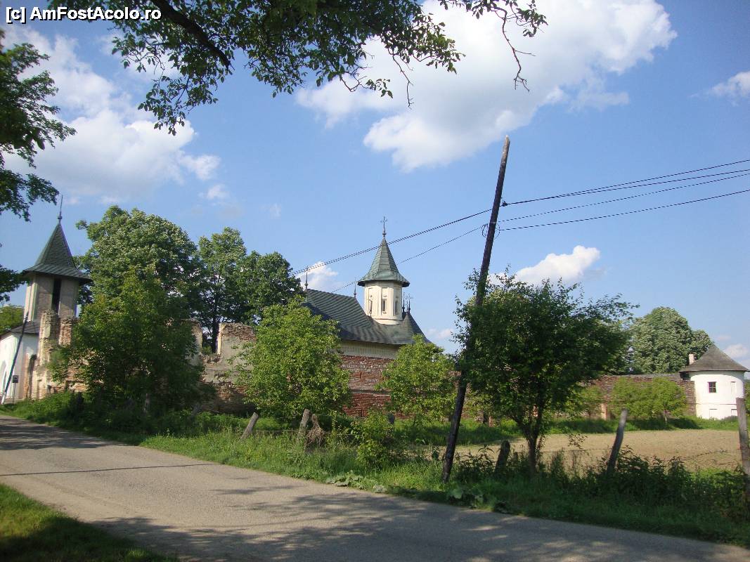 [P05] Fosta mănăstire Mera văzută dintr-o altă parte a drumului de acces. Se remarcă zidul de incintă care dă obiectivului un aspect de fortăreață mediavală.