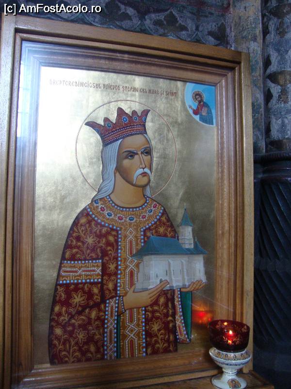[P21] Am observat o icoană mai recentă în care este înfățișat Dreptcredinciosul Voievod Ștefan cel Mare și Sfânt care ține în mâini biserica mănăstirii Neamț pentru a o închina divinității.