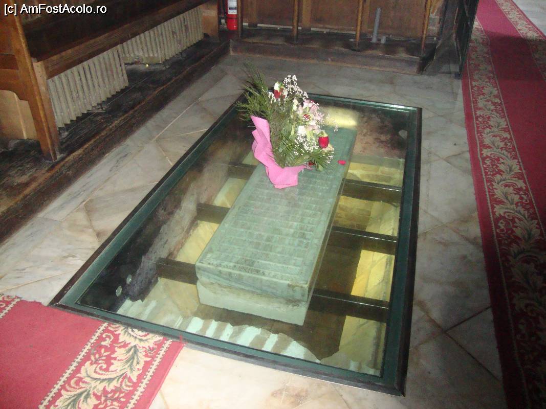 [P24] Încăperea mormintelor - în dreapta este o piatră funerară așezată pe câteva bare metalice și acoperită cu sticlă transparentă. Cele câteva informații afișate în apropiere ne arată că acolo își doarme somnul de veci începând cu anul 1795 vestitul stareț Paisie Malorusianul.