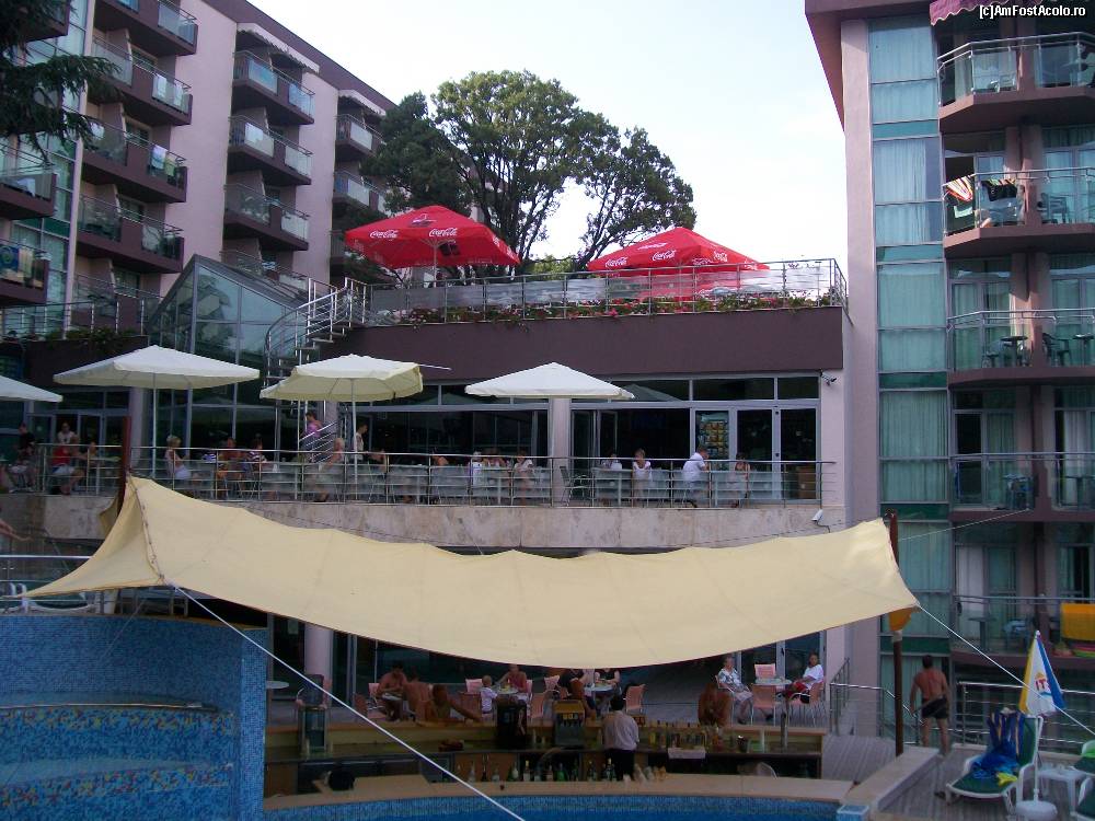 [P04] in prim plan se vede pool-bar, iar intre cele 2 corpuri ale hotelului sunt amplasate pe rand, de jos in sus: piscina interioara, loby-bar si receptia, iar sus este o terasa f. frumos amenajata ptr. luat masa sau doar pt. a savura o cafea. Copacul care se vede in spate este in interiorul retaurantului