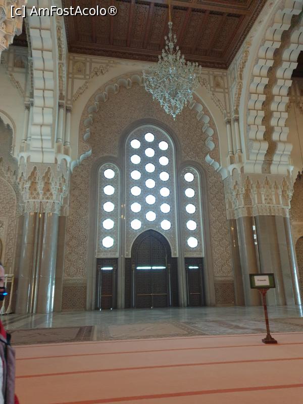 [P25] Pentru ca regele Hasan al II-lea a dorit ca cele 3 elemente esentiale vietii (aer, apa, pamant) sa se regaseasca aici, acoperisul salii de rugaciune a fost conceput astfel incat, in zilele senine si calduroase, acesta poate fi retractat in 5 minute, datorita unui sistem de rulare cu roti autopropulsate, astfel incat lumina sa patrunda in interior.
