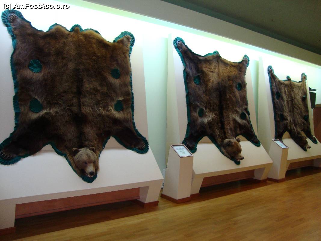 [P26] Pe pereți sunt expuse numeroase blănuri de urși, alături de informații privind locul de proveniență, anul și punctajul trofeului.