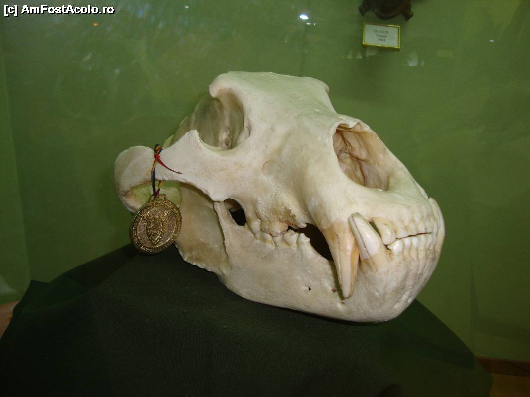 [P29] Diverse trofee craniu de urs. Unul iese în evidență prin faptul că are atașată o medalie; panoul informativ ne-a arătat că acest craniu de urs este pe locul trei în lume, cu un punctaj de 69,20 C. I. C.