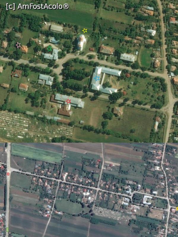 [P21] Satul model Dioști azi - prelucrare Internet. Legendă: roșu: școala, verde: primăria, galben: biserica, albastru: căminul cultural, roz: poșta, maro: cabinet medical.