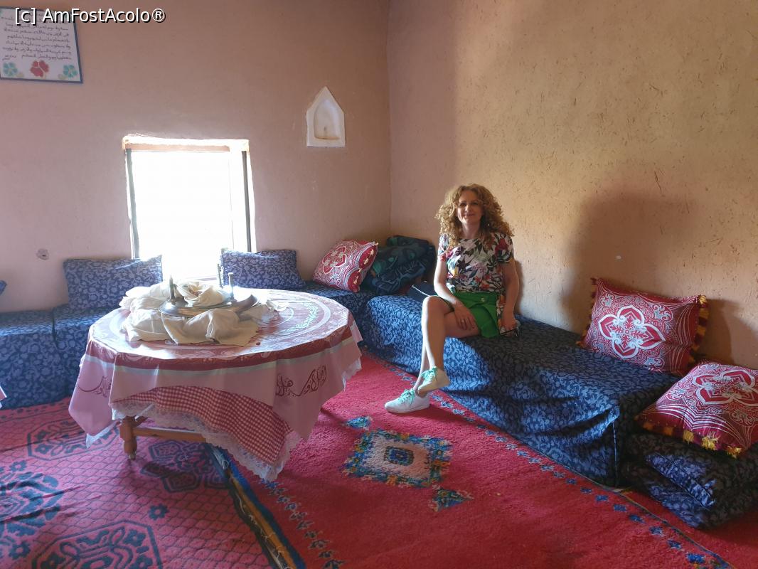 [P34] La intoarcere, un ghid imbracat precum berberii locului, ne-a auzit vorbind si ne-a salutat in romaneste, dupa care a enumerat cateva orase din Romania. Am fost uimiti, asa ca ne-a explicat ca a lucrat ca si ghid in tara noastra, vizitand cateva orase, Timisoara, Constanta si bineinteles, capitala. Am facut o fotografie impreuna cu el, in special pentru ca mi-a placut costumatia de un albastru electric si sandalele cu accesorii din blana.