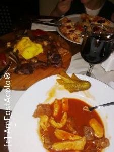 ![[P01] tigaie picanta (nu recomand); cotlet de berbecut cu mamaliguta (foarte bun) si pizza Carpati (delicioasa)... acompaniate de un vin bun (pentru adulti)... sau ceai cu lamaie (pentru copil) » foto by myk007