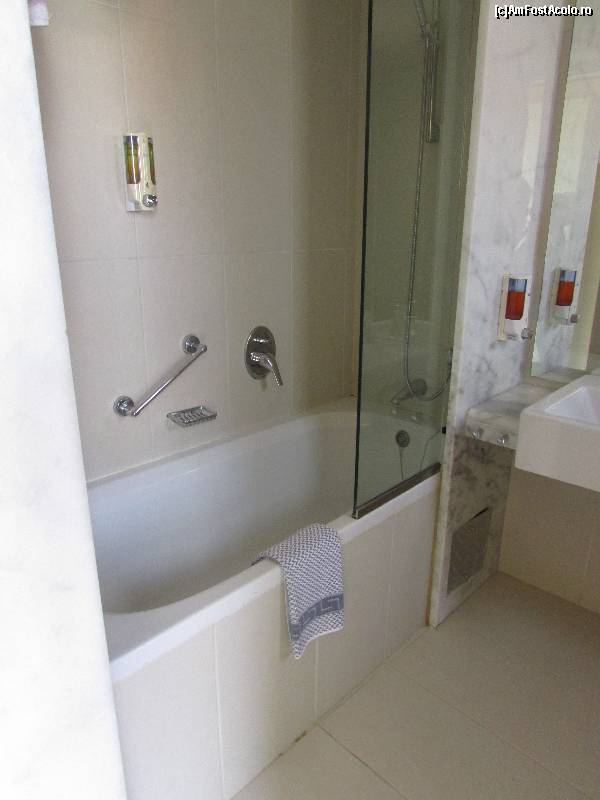 [P22] O parte a băii; doze cu săpun lichid lângă chiuvetă, dar şi lângă cadă