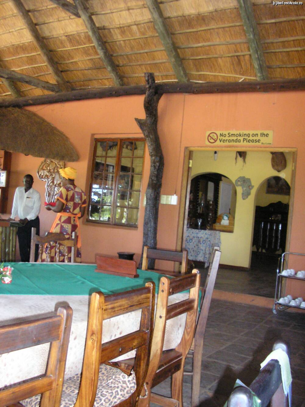 [P03] sala de masa asezata langa receptie,toata constructia este decorata cu arta africana